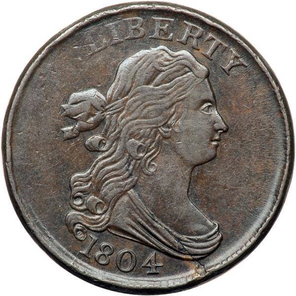 1804 C-13 R1 Plain 4 without Stems EF40. Cracked Planchet. Slightly sharper but there are some very light rim bruises on both sides plus a dull rim nick at the first S in STATES and another just left of the fraction. Glossy chocolate and steel brown with underlying frosty luster showing through in the fields and protected areas. EDS, Manley state 1.0. There is an obvious planchet crack from the rim off the bust tip extending into the hair over the shoulder where if fades away. The same planchet crack extends from the rim down the left edge of the O in OF into the leaves below. A sharp, attractive example of this simple yet rare type of mint error. Davy #04.13.46.