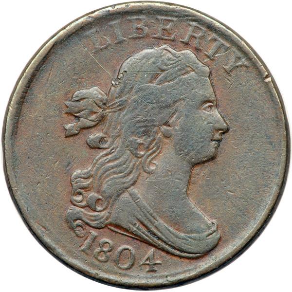 1804 C-13 R1 Plain 4 without Stems F15. Double Struck with Minor Shift. Ten points sharper but the planchet is covered with extremely fine roughness that's visible only with the aid of a good glass. No verdigris, and the only notable marks are a fine pinscratch in the field behind the head and a dull pinch on the rim just right of the fraction. Frosty chocolate and light olive brown with lighter brown toning in protected areas and darker steel toning on the highpoints. Double struck with a tiny offset to K-9 on both sides. The doubling is clearly visible on the date, profile, and much of LIBERTY with similar doubling on the wreath and fraction. MDS, Manley state 2.0. Davy #04.13.37.