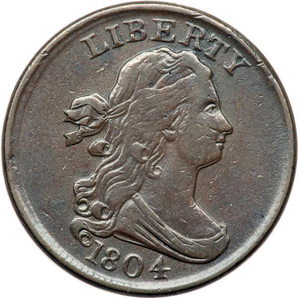 1804 C-13 R1 Plain 4 without Stems F15. Double Profile/Chatter Strike. Glossy olive brown and chocolate with hints of bluish steel overtones on the reverse. Smooth and attractive, free of any notable defects. There is a clearly defined double profile from the tip of the nose down to the throat plus similar doubling on the hair ribbons. The shift was to K-10 and is attributable to die bounce rather than a real double strike. The reverse displays no hint of doubling or of the swelling that we usually see after being struck against a new blank planchet creating a brockage. MDS, Manley state 2.0. Davy #04.13.33.