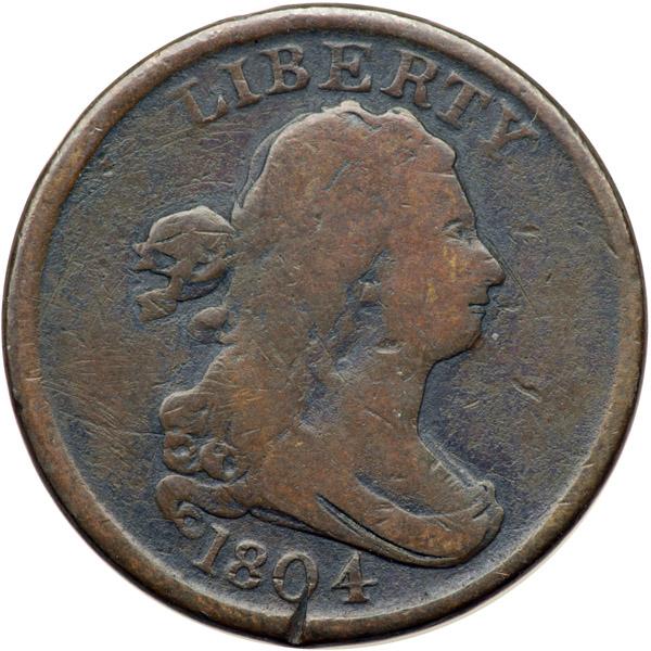 1804 C-13 R1 Plain 4 without Stems G5. Double Struck with Minor Rotation, Reverse Brockage Maker. Very slightly sharper but there is a significant nick-like pinch on the rim under the 0 in the date and at the opposing rim over E in STATES. The surfaces are not perfectly smooth and there are some old, light contact marks covering the field behind the portrait. But it doesn't look as bad as these words might imply. The date and legends are complete and clear and the devices remain glossy chocolate brown while the fields are a less glossy olive and dark chocolate. Double struck with a small, perhaps .5mm, CW rotation between the strikes. The doubling is clear along the back of the head and upper edge of the bust, and Ms Liberty has two mouths. The reverse shows no doubling. Instead it was pressed against a new blank planchet creating a reverse brockage during the second strike. Very similar to the preceding lot, although the extra blank planchet was centered against this piece. MDS, Manley state 2.0, showing many clear dentils on the reverse. Davy #04.13.25.