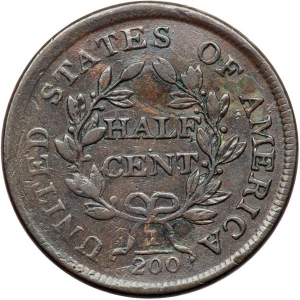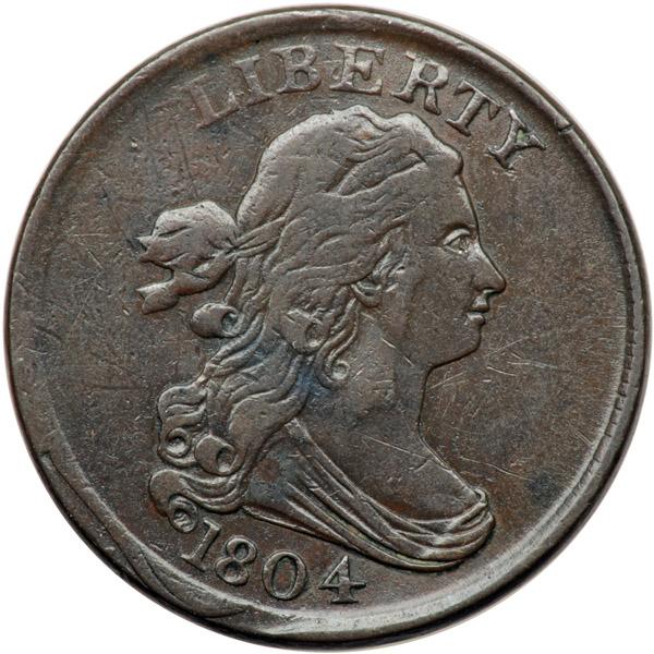 1804 C-13 R1 Plain 4 without Stems VF20. Double Struck Off Center, Off Center Reverse Brockage Maker. Attractive glossy chocolate brown with a splash of darker steel and olive toning in the hair left of the neck. The only notable marks are a spot of raised reddish brown verdigris under the A in STATES and traces of glue over ALF in HALF. Double struck. The first strike was centered on the planchet. The second strike was 10% off center to K-8 leaving the nose and lips of Ms Liberty on the neck of the centered strike and her bust tip on the rim under the 18. The very top of the 4 shows on the rim under the lowest curl. There is no doubling on the reverse, but there is an impression from a new blank planchet positioned about 20% off center that left a depressed arc through the fraction. Apparently the second strike created an off center reverse brockage impression on the second planchet. There is swelling at the top of the wreath which is consistent with being a brockage-maker. A neat error. EDS, Manley state 1.0. Davy #04.13.30.