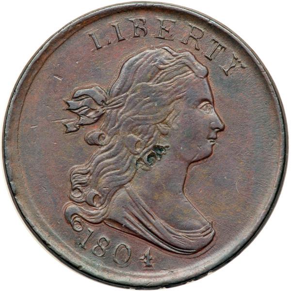 1804 C-13 R1 Plain 4 without Stems VF25. Triple Struck with Minor Shift. Sharpness AU50 but there is an obvious dig high on the neck that is really three closely spaced shallow digs that connect. In addition, there is "XXXI" carefully cut onto the edge of the planchet under the bust tip, but this mark only shows when you look directly at the edge. The surfaces are decent but traces of extremely faint granularity can be found in protected areas. No verdigris. Mostly glossy reddish chocolate and steel with darker steel brown toning on the highpoints. This piece was struck three times but the offset between impressions was small, less than a half millimeter. Sharp, clear doubling shows on the date, LIBERTY, and most of the portrait. The reverse displays clear triple outlines on parts of HALF CENT, the ribbon, fraction, and UNI in addition to clear doubling everywhere else on that side. The date and LIBERTY are very thin due to the shift in strikes and that gives this piece a very curious appearance. MDS, Manley state 2.0. Davy #04.13.41.