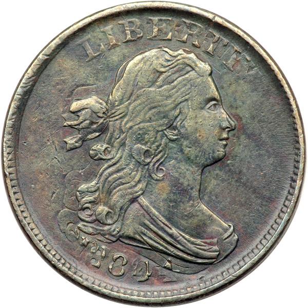 1804 C-13 R1 Plain 4 without Stems VF30. Double Struck Reverse Brockage Maker. Ten points sharper but lightly cleaned and retoned frosty light olive and reddish chocolate brown. There are some faint hairlines remaining from the cleaning but no roughness or other notable marks. Double struck. Both strikes were centered on the planchet and the second was rotated 10 degrees CCW relative to the first. The doubling is obvious on the obverse, especially on the date and LIBERTY, which now reads LIBBEERRTTYY. There is no doubling on the reverse. Instead, it was struck into a new blank planchet during the second strike thereby creating a reverse brockage on the new planchet. The usual swelling associated with being used to create a brockage is obvious on the reverse. A sharp, attractive mint error that should improve as the toning matures.