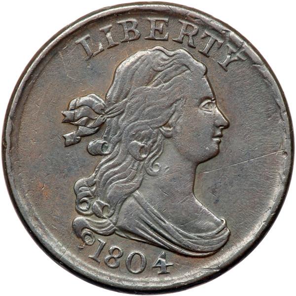 1804 C-13 R1 Plain 4 without Stems VF35. Double Struck over Off Center Reverse Brockage. Very attractive glossy olive brown and steel with frost in protected areas. No hint of roughness or verdigris. The only notable mark is a light diagonal hairline scratch in the field before the chin. Double struck. The initial strike was a reverse brockage struck about 30% off center. The misstruck piece was then sent through the press a second time and struck normally. Clear evidence of the incuse reverse brockage shows on the obverse rim from K-12 clockwise to K-4, and an impressed arc from the outer edge of the previously struck piece being struck against this planchet shows from LI through the hair ribbon and lower curls to the rim under the bust tip. Portions of the normally struck reverse, including several leaves and berries from the wreath, show clearly on the rim above AMERIC of the centered strike. An attractive example of a really neat mint error. MDS, Manley state 2.0. Davy #04.13.29.