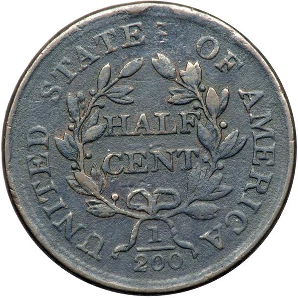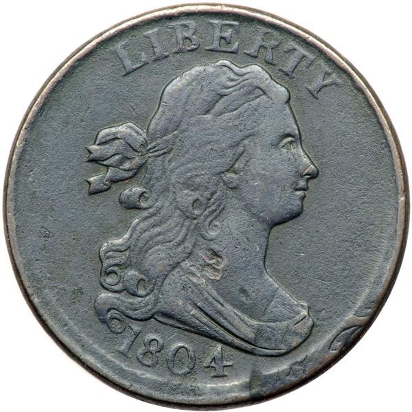 1804 C-13 R1 Plain 4 without Stems VG10. Double Struck with Off Center Reverse Brockage. Sharpness near VF25 but dark and covered with extremely fine roughness. No verdigris, and the only marks are a couple small, dull digs on the bottom of the neck. Dark steel with some gloss on the highpoints while most of the planchet is rather dull. Double struck. One strike was normal but there is an 80% off center reverse brockage impression at the bust tip. Clear incuse designs of the wreath are visible on the rim off the bust tip and portions of a letter (perhaps an E or F) from the legend outside the wreath shows on the rim under the bust tip. In addition, weaker but easily visible evidence of another strike shows at the second S in STATES. Most likely the initial strike was the off center reverse brockage and the second was the normally centered impression. Davy #04.13.44.