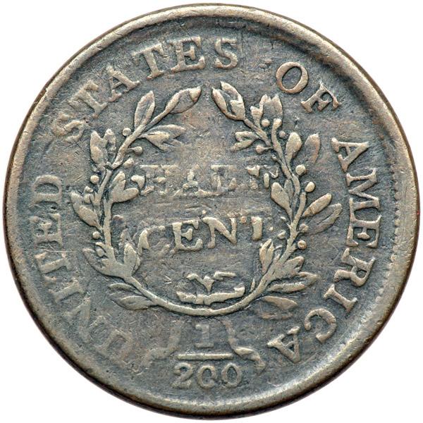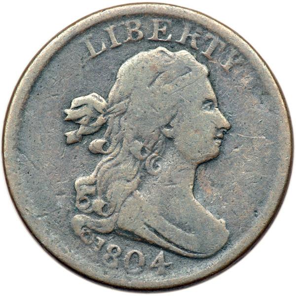 1804 C-13 R1 Plain 4 without Stems VG8. Double Struck Obverse Brockage Maker. Glossy steel brown and chocolate with darker chocolate and olive brown toning in the protected areas. No roughness or notable marks, just normal wear. LDS, Manley state 3.0. Double struck with both impressions centered on the planchet. The reverse was struck two times by the, and those impressions were rotated about 10 degrees between the strikes. The doubling is obvious in the wreath, and "HALF" is not parallel with "CENT" creating a very curious look indeed. The obverse, however, shows no evidence of doubling. Instead, it was pressed into a new blank planchet during the second strike creating an obverse brockage on that planchet.