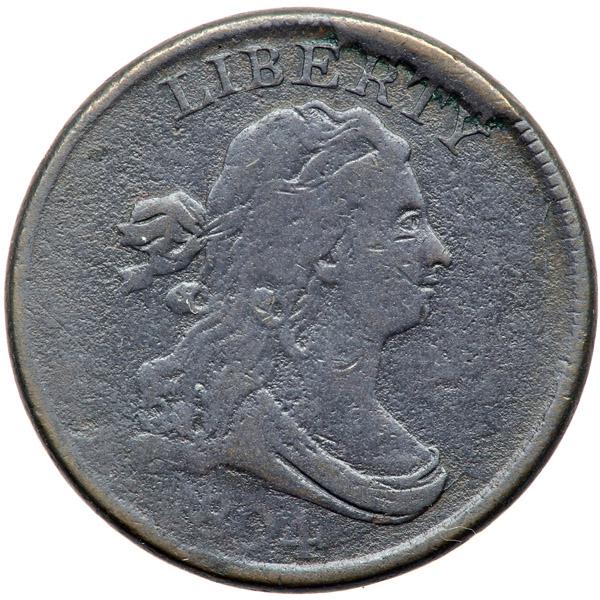 1804 C-2 R6 G6. Sharpness F12 but covered with fine uniform granularity. No verdigris or notable marks. Slightly glossy very dark steel brown with traces of lighter brown and chocolate toning in protected areas on the reverse. Struck with the dies not in perfect parallel alignment, as always for this variety. The result is a relatively weak strike on the lower left quadrant of the obverse and the opposing area at TED-ST. The date is weak but complete and easily readable and the legends are complete as well in spite of the usual weakness at TED-ST. Extremely rare LDS, Manley state 3.0, with the strong cud break over ERTY. At least a third of the known examples of this rare variety have the cud break, but that's still a small population. Tied for CC#8 in the Spurlock census, independent of the die state. The reverse is rotated 20 degrees CW. Davy #04.2.4.