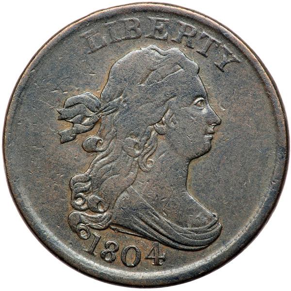1804 C-3/5 R7 Without Spike From Chin F12. Glossy dark steel brown and chocolate. The surfaces are smooth, void of any hint of corrosion or verdigris. There is a faint hairline scratch hidden in the drapery folds over the 4 and some extremely faint hairlines on the highpoints of both sides. A tiny nick on the truncation above the 8 is a good identifying mark. Very nice for the grade in spite of the faint hairlines, close to F15. Well struck and the "spikeless" chin feature strong. Equal to the second finest known of the "Spikeless Chin" version of C-5 in the Spurlock census; far superior to the Breen plate coin. Plated in the Manley book to illustrate the variety and his die state 2.0. A highlight of any collection that emphasizes die states. Davy #04.3.2.