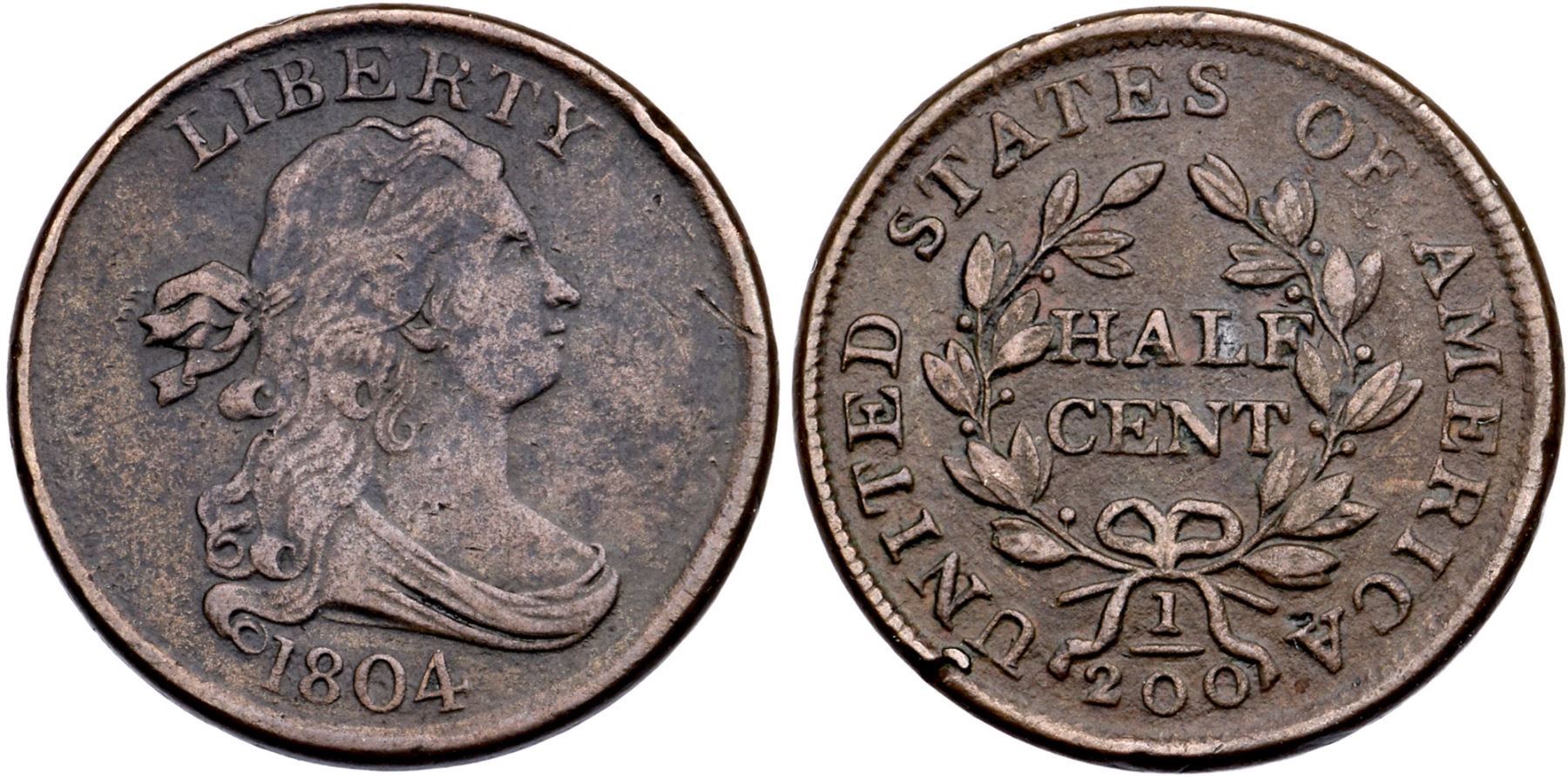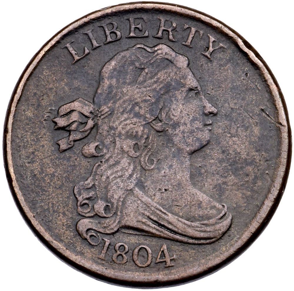 1804 C-4 R-4+ VG10Near VF sharpness but microgranularity covers the surfaces and there is a notable rim nick over U in UNITED. There Are also a few dull scratches before Liberty's nose and mouth, and a tiny pit below the last A in AMERICA. Mottled medium brown and deep steel brown on the obverse, mostly medium brown reverse. EDS, Manley State 1.0. 84.0 grains. This is the Gilbert plate coin for the obverse. Comes with a nice provenance. Broken out of an NGC VF Details holder with the Cohen and Partrick provenance noted (5747079-017).Certificate Number: Pedigree: Ex:Gilbert (Plate Coin)-Commodore W. C. Eaton (sold privately)-“Anderson Dupont” Sale (Stack’s) 11/1954:1074-Philip M. Showers (Stack’s privately 1969)-Willis I. DuPont-R. Tettenhorst-Bill Weber-Roger S. Cohen, Jr. (Superior) 2/1992:143-John Hanson-Donald G. Partrick HA 4/23/2021:3644 - Bob Kebler Collection