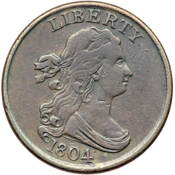 1804 C-4 R5 F15+. Choice glossy chocolate and light olive brown. Smooth and very attractive, close to VF20. The only marks, and they are trivial, are a tiny nick on the throat, another close under the 4 in the date, and a minor rim bruise over AT in STATES. M-LDS, Manley state 3.0 early. A faint die crack extends from the crosslet of the 4 through the bust tip and into the field beyond. CC#9 in the Jim McGuigan census and on the Roger S. Cohen, Jr. census list. Noyes photo #73660. Weight 82.9 grains.