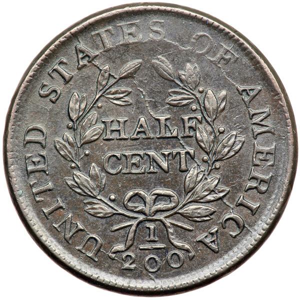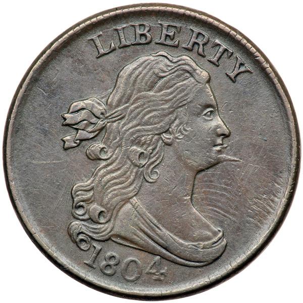 1804 C-5 R4 Spiked Chin EF40. Slightly sharper but there are a few light pinscratches in the field before the neck and several more left of the lowest curls. All the scratches are old and blend perfectly into the natural toning. Otherwise this piece is very nice and the reverse is choice. Very attractive glossy chocolate brown with underlying frosty luster showing through in the protected areas. M-LDS, Manley state 5.0. The bisecting die crack on the reverse is strong and another crack reaches from the base of the O in OF down through the leaves to the bisecting crack above LF. The "Spiked Chin" feature is clear. Tied for CC#8 in the Mike Spurlock census, CC#11 in the Jim McGuigan list, and #7 in the Breen census. Finished 5th in the 2004 EAC Half Cent Happening. Noyes photo #73667. Weight 81.3 grains. Comes with a nice provenance.