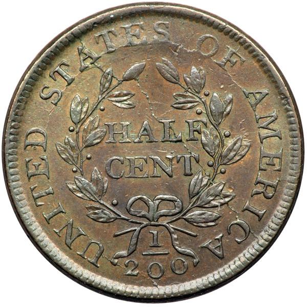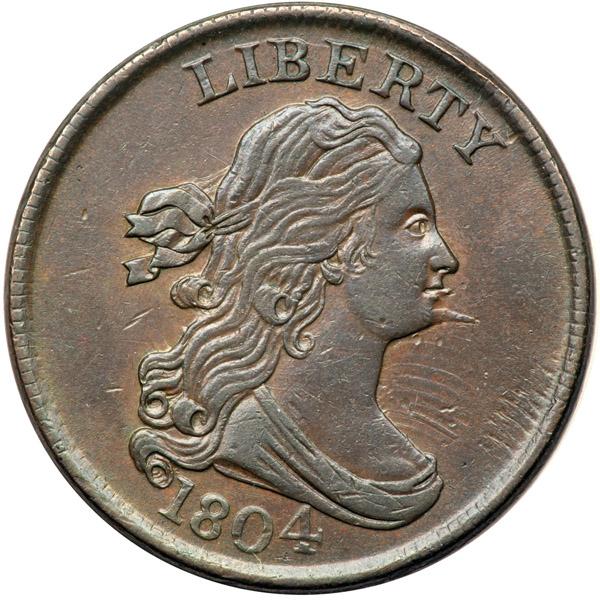 1804 C-5 R4 Spiked Chin EF45. Choice glossy chocolate brown with frosty light brown toning in the protected areas. The only notable defect is a light scrape on the rim over RT in LIBERTY. M-LDS, Manley state 5.0. The bisecting reverse crack has been joined by a new crack from the base of the O in OF through the wreath to the earlier crack just above the L in HALF. The "Spiked Chin" feature is obvious. A very nice example, near the lower end of the condition census for this scarce variety. And it comes with a provenance from a great collection. Davy #04.5.2.
