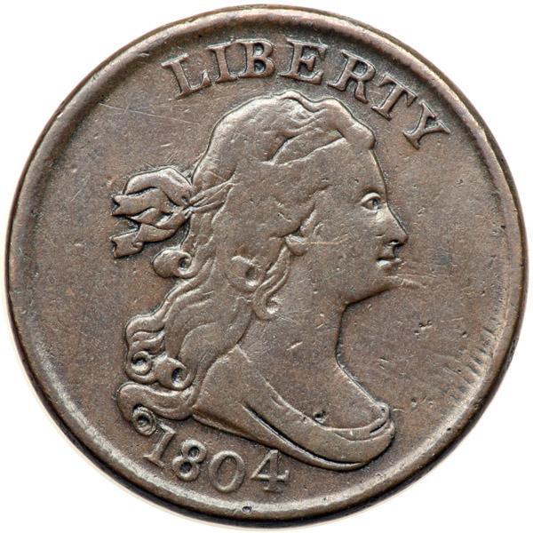 1804 C-5 R4 Spiked Chin F12. Choice glossy chocolate and steel. Smooth and quite nice for the grade with just a couple minor contact marks. The notable marks are a pinprick on the bust at the drapery line and a small rim bruise at ES in STATES. MDS, Manley state 4.0. A gentle bulge shows in the field before the portrait and the reverse crack is continuous from the A in STATES to the C in AMERICA. The "Spiked Chin" feature (caused by damage to the die very early in the marriage) is obvious. Davy #04.5.6.