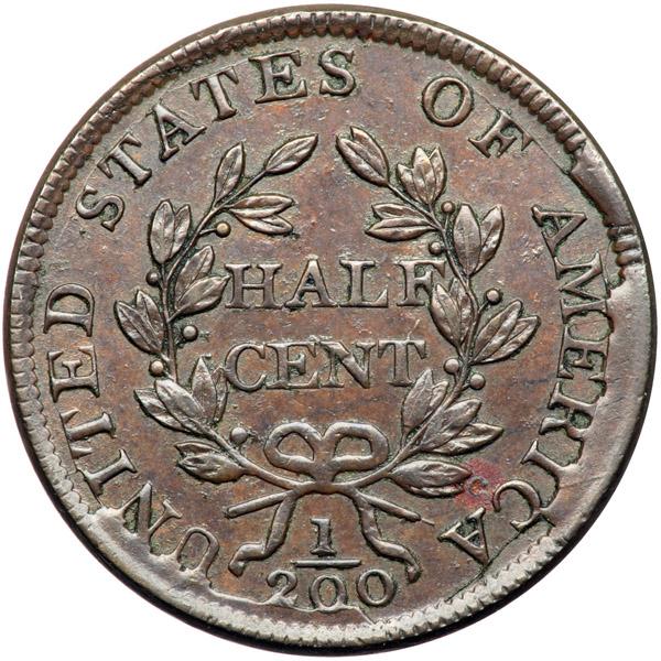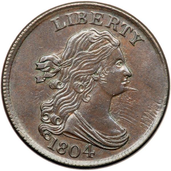 1804 C-6 R2 Spiked Chin AU50+. Glossy dark chocolate brown with frost in protected areas. The only notable defects are a spot of reddish verdigris under the CA in AMERICA and a horizontal nick close under the earlobe. Otherwise this piece is choice. Close to AU55. M-LDS, Manley state 9.0, Braig 6.0, with a wedge-shaped cud break over the first A in AMERICA. The "Spiked Chin" feature is strong. Davy #04.6.11.