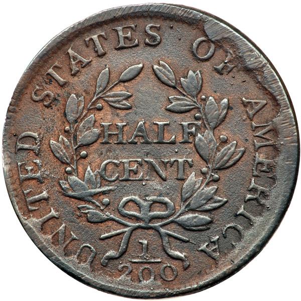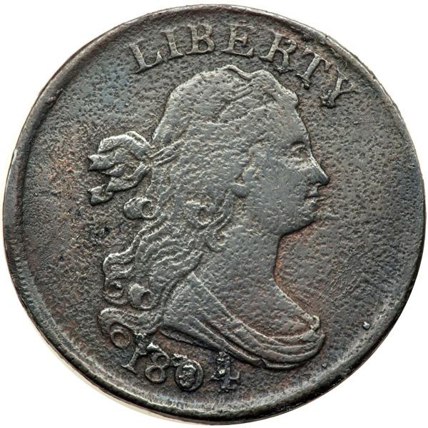 1804 C-6 R2 Spiked Chin Cast Copy of Fictional Die State EF40. Slightly glossy dark steel and olive with traces of lighter toning in protected areas. The surfaces are covered with pebbled roughness imparted by the casting process. The highpoints have been rubbed a bit and the obverse displays a few faint hairlines on those highpoints. Otherwise this piece is as made. The die state is later than the latest known with an additional cud break connecting OF to the rim above. This piece was a whimsy of a couple prominent half cent collectors and made to their order. Davy #04.6.31.