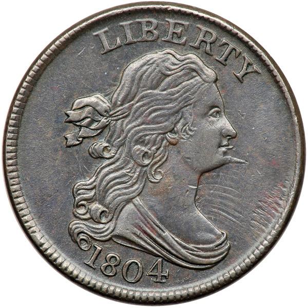 1804 C-6 R2 Spiked Chin EF45. Choice glossy chocolate and steel. Smooth and very attractive nearly flawless. Underlying frosty mint luster covers the obverse fields and the reverse fields are slightly reflective. The only notable mark, and it is trivial, is a tiny nick on the front edge of the neck. Nicely struck MDS, Manley state 7.0, and possibly the finest known of that die state. The raised retained cud break over UN is not yet complete over the right side of the N. The "Spiked Chin" feature is bold. Great eye appeal for the grade. Weight 89.8 grains.