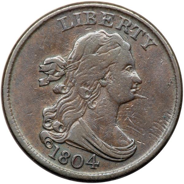 1804 C-6 R2 Spiked Chin VF20. Glossy chocolate brown with reddish chocolate toning on the leaves below the first A in AMERICA. A smooth, very attractive example for the grade. E-MDS, Manley state 2.5, Braig 1.8., with stronger die cracks on either side of the top of A in STATES (Braig's "Flying A") but before the die crack from the top of the C in AMERICA to the rim. The "Spiked Chin" is obvious. Davy #04.6.3.