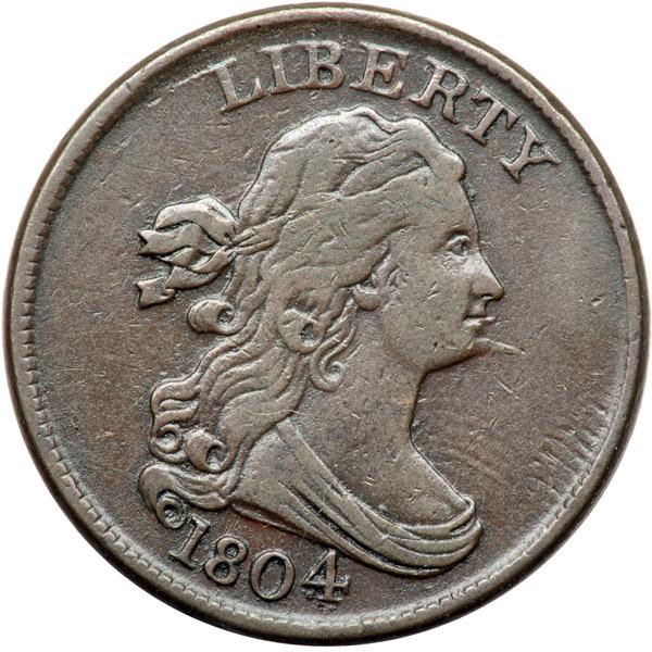 1804 C-6 R2 Spiked Chin VF20. Glossy chocolate and steel. No defects, just a few trivial marks on smooth surfaces. Very nice for the grade. M-LDS, Manley state 9.5, Braig 6.5, with the area above the I in UNITED slightly raised as a retained cud. The "Spiked Chin" is clear. Davy #04.6.20.