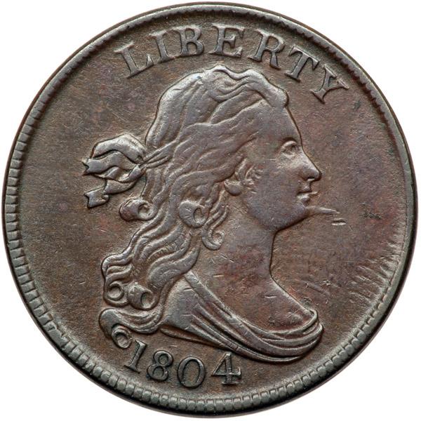 1804 C-6 R2 Spiked Chin VF30. Very attractive glossy chocolate brown with a bit of dirt in the most-protected areas. The best identifying mark is a tiny horizontal nick close under the tip of the "Spike" on the chin. MDS, Manley state 6.0 late or 6.5 early, Braig 4.5. There is a strong cud break over MERIC and the area above the left top of N in UNITED is mushy and slightly raised. The "Spiked Chin" is clear. Davy #04.6.24.