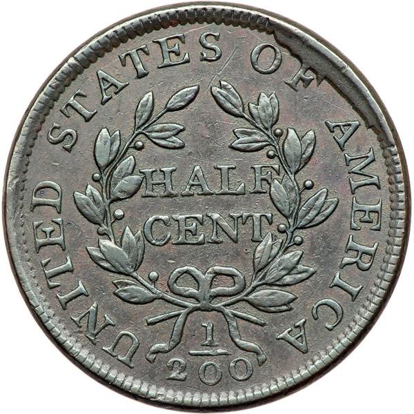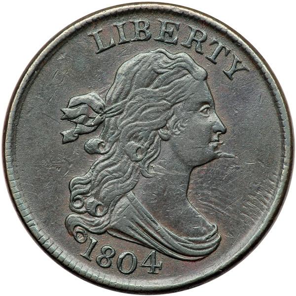 1804 C-7 R4 Spiked Chin EF40. Nice glossy chocolate and steel with frosty lighter steel brown toning in protected areas on both sides. The only defects are some very light contact marks hidden in the hair and a short, fine hairline scratch under the second S in STATES. None of these marks is at all significant and this piece offers excellent eye appeal for the grade. M-LDS, Manley state 5.0, with a strong cud break at OF-A that does not quite touch the top of that O. The "Spiked Chin" feature is clear. This piece is plated on page 237 in the Breen half cent encyclopedia to illustrate Breen's die state VI. A very important example of a rare die variety. Called CC#4 in the Mike Spurlock and Jim McGuigan census lists; listed third in the Breen census. Noyes photo #73643. Weight 83.3 grains.