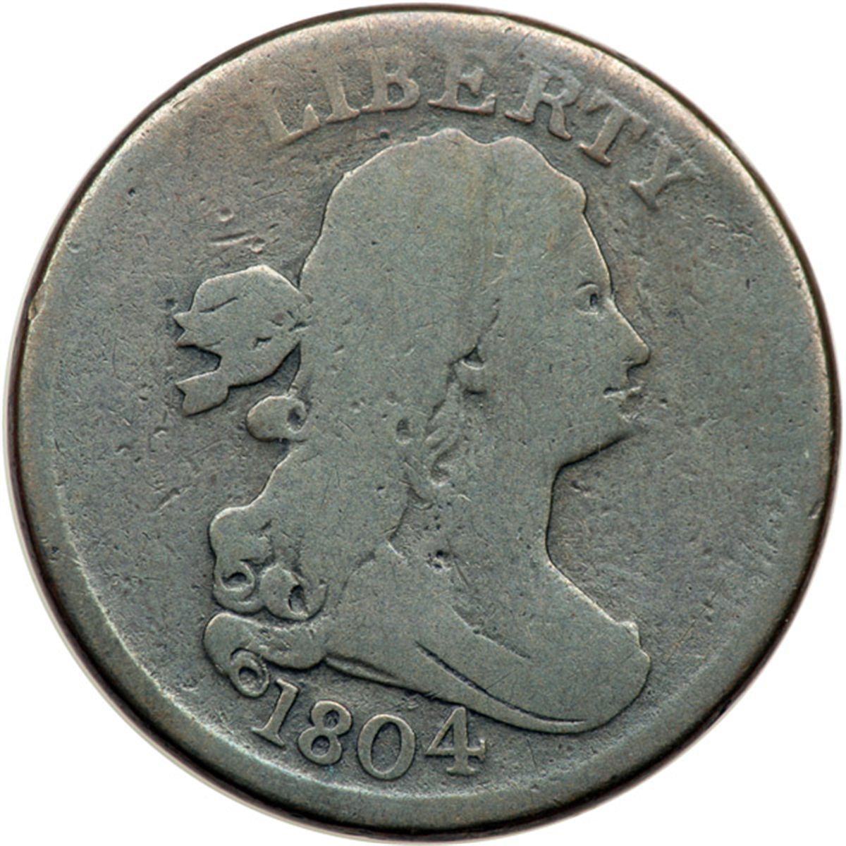 1804 C-7 R4 Spiked Chin G5. Glossy light olive brown and steel. Smooth and attractive for the grade, just well worn. The date is strong and the legends are clear. M-LDS, Manley state 7.0, with strong cud breaks at OF AMERI. This is the Manley plate coin for the die state in his reference book on the series.