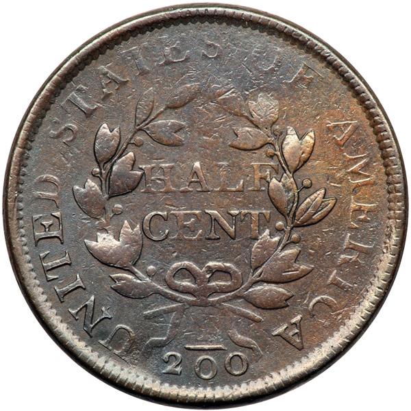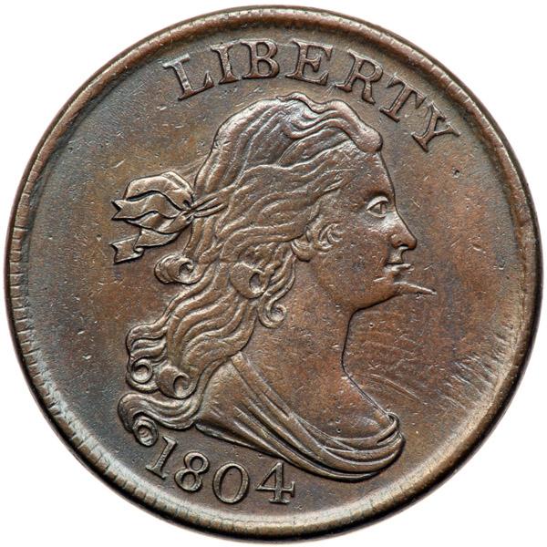 1804 C-7 R4 Spiked Chin VF25. Sharpness EF40 but lightly whizzed, then nicely retoned a very attractive and natural-looking glossy chocolate and olive brown. No spots, stains, or notable signs of contact. However, there is a shallow depression on the left side of the U in UNITED that appears to have been caused by debris on the die. The obverse is sharply struck but the reverse was weakly impressed, perhaps due to a thin layer of grease or oil on the die (your cataloger has seen several with similar weak strikes on the reverse). EDS, Manley state 1.0, before any die cracks on the reverse. The "Spiked Chin" is strong. Davy #04.7.1.