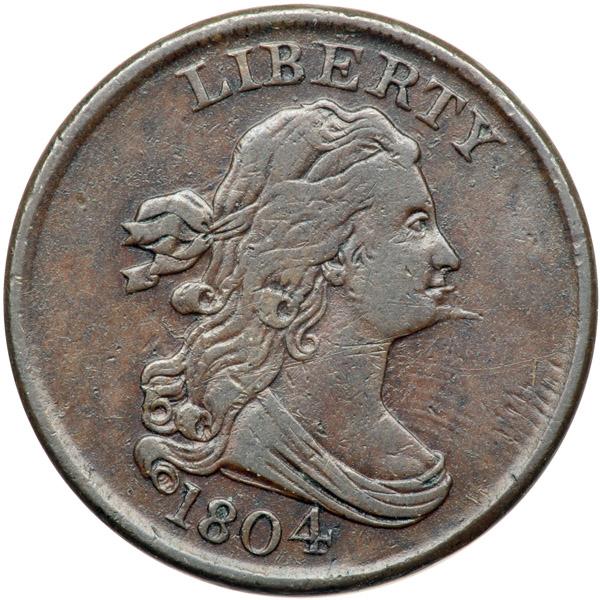 1804 C-7 R4 Spiked Chin VF25. Glossy chocolate brown blending to lighter steel brown in the obverse fields. The surfaces are smooth and the eye appeal is excellent. The only notable marks are a few very faint hairline scratches from the throat to the hair over the shoulder. Otherwise this piece is close to VF30. M-LDS, Manley state 6.0. The cud break over OF-A touches the O, an extremely rare die state. The "Spiked Chin" is strong. Davy #04.7.5.