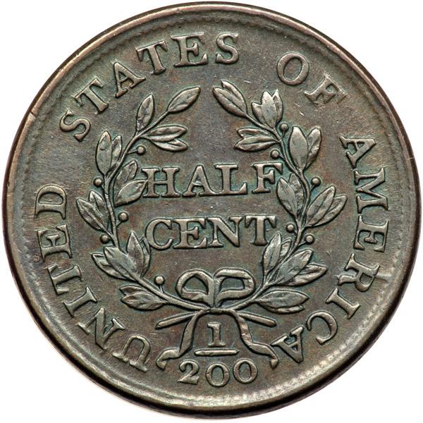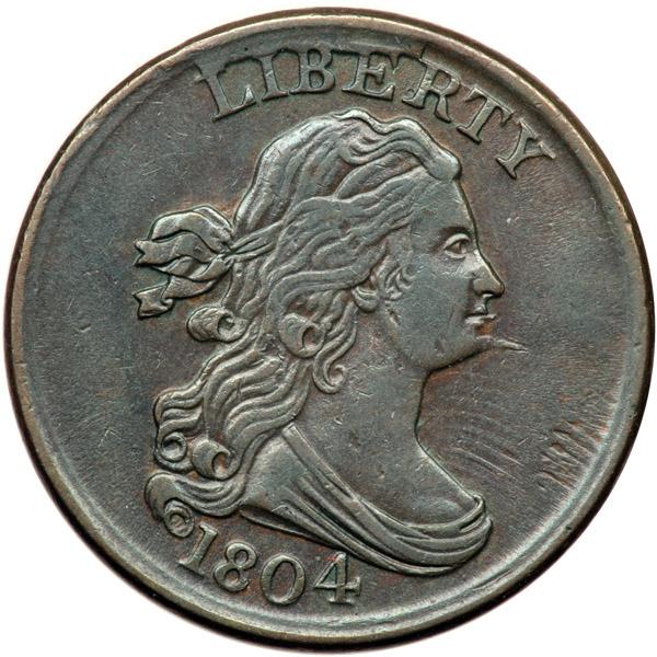 1804 C-8 R1 Spiked Chin EF40. Glossy chocolate brown with steel and light olive brown toning on the highpoints. Frosty flowline luster shows in protected areas, especially on the reverse. The only marks are a few small ticks on the portrait, none significant. LDS, Manley state 6.0, with a raised retained cud connecting LIBE to the rim. This attractive piece is plated in the second edition of the Cohen half cent book (page 52) to illustrate what he calls the "Broken Obverse" die state. The "Spiked Chin" is obvious. Davy #04.8.23.