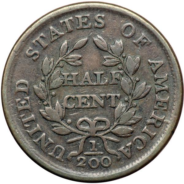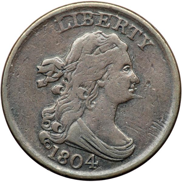 1804 C-8 R1 Spiked Chin F12. Glossy medium chocolate brown fading to slightly darker chocolate toning in protected areas. The only notable mark is a dull nick in the field off the tip of the nose. M-LDS, Manley state 4.0 late. The crack through LIBERTY is stronger and there is a new, relatively strong radial crack up to the dentils from the earlier crack between the E & R. A slightly raised retained cud shows above LI but the upper edge of the I is still defined (the top of the I is lost in the retained cud for state 5.0). The "Spiked Chin" is dull but visible. Davy #04.8.21.
