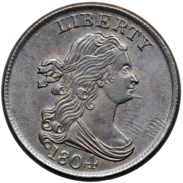 1804 C-8 R1 Spiked Chin. PCGS graded MS-64 Brown. Choice lustrous bluish steel and olive. The surfaces are satiny and virtually flawless offering great eye appeal. The best identifying marks, and they are microscopic, are a tiny tick on the lower lip, another on the end of the chin, and a thin, very light scuff along the dentil tips left of the L in LIBERTY. E-MDS, Manley state 2.0 late, with a fine die crack from the top of the L to the rim above and more than half the dentils clearly visible. The "Spiked Chin" feature is obvious and the reverse is rotated 10 degrees CCW. Our grade is MS60+, very close to MS63. The attribution, Spiked Chin feature, and Whister provenance are all noted on the PCGS label. Noyes photo #73668. Weight 86.2 grains. PCGS population 3; none finer at PCGS.