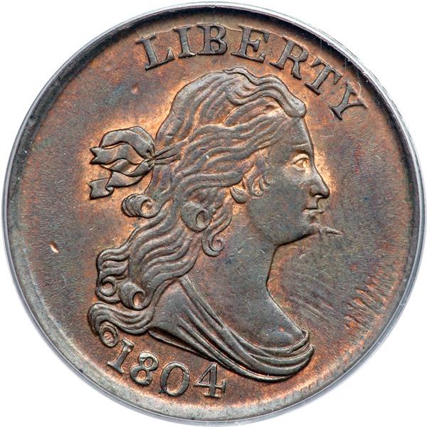 1804 C-8 R1 Spiked Chin. PCGS graded MS-64 Brown. Lustrous bluish steel brown with 20% of the mint red remaining on the obverse, 5% on the reverse. Would rate a slightly grade if not for a few tiny contact marks, including a tick in the field left of the lower curls, two more left of the L in LIBERTY, a couple more on the tops of the 1 & 8 in the date, and a tiny one under the E in UNITED. None of these marks is distracting and the overall eye appeal of this piece is excellent. MDS, Manley state 3.0. The die crack through the top of LIBER is clear but not strong. The "Spiked Chin" feature is obvious. Our grade is MS62. PCGS population 4 with none finer. The attribution, Spiked Chin feature, and Davy provenance are noted on the PCGS label. Davy #04.8.18.