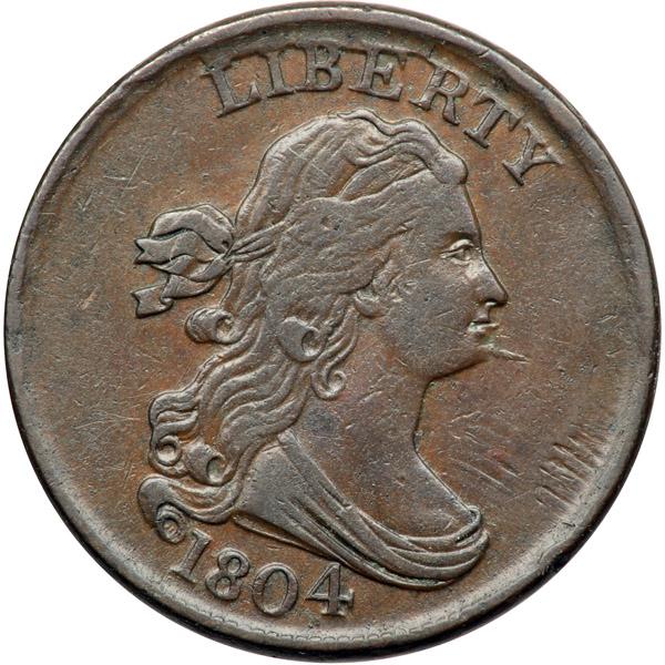 1804 C-8 R1 Spiked Chin VF30. Glossy chocolate and steel with slightly lighter brown toning in protected areas around the portrait. Close to VF35 but there are some small contact marks, including a rim nick at ES in STATES and another at the I in AMERICA. LDS, Manley state 6.0, with a raised retained cud break over LIBE. The "Spiked Chin" is dull but visible. Davy #04.8.2.