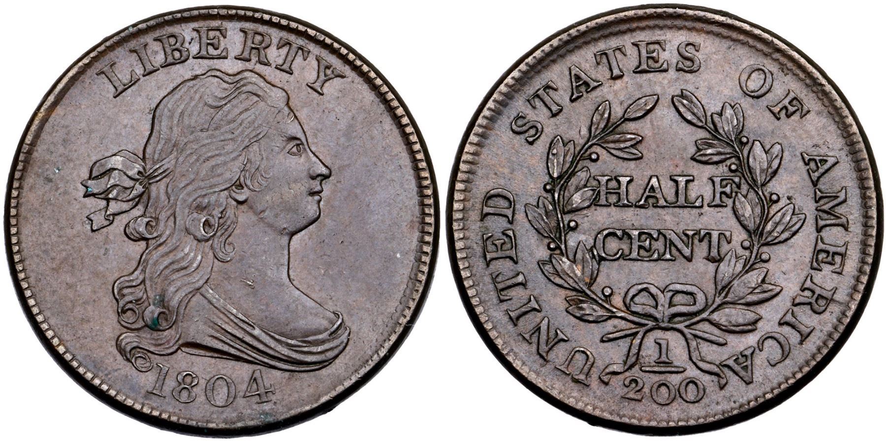 1804 C-9 R-2 Crosslet 4 Stems AU50Attractive chocolate and light steel brown surfaces. There are a few tiny, trivial pin scratches above the eye and in the hair visible under a glass that blend in well. Frosty, lustrous surfaces, excellent eye appeal. Manley state 2.0. 88.4 grains. Comes with a very nice provenance. Broken out of an NGC MS61BN holder with the Brobson and Partrick provenance noted (5747080-011).Certificate Number: Pedigree: Ex: Dr. D. W. Valentine (Thomas L. Elder) 12/1927:492 - Hillyer Ryder Collection - Ryder Estate - Wayte Raymond-(New Netherlands) 6/1954:287 - Joseph Brobston (Stack’s FPL #9, 1/1963 - Jon Hanson (6/23/1973) -Donald G. Partrick HA 4/23/2021:3650 - Bob Kebler Collection