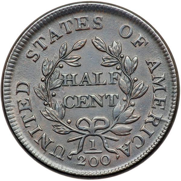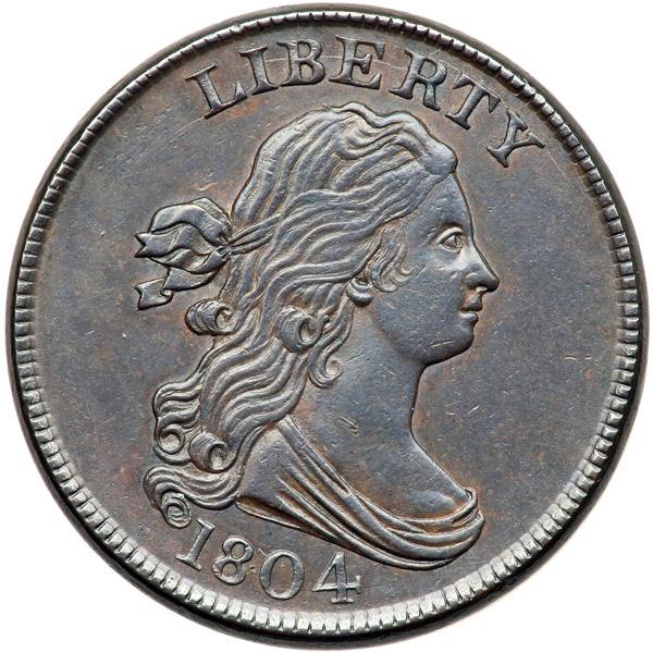 1804 C-9 R2 AU50. Sharpness near mint state but very lightly cleaned and expertly retoned glossy dark chocolate brown and steel with frosty lighter steel brown toning in the protected areas. Otherwise this half cent is very choice and offers outstanding eye appeal. The surfaces are virtually flawless. E-MDS, Manley state 2.0, with delicate overlapping die clashmarks on the reverse. The obverse fields are hard and slightly reflective. A very fine double profile shows on the nose, lips, chin, and neck (caused by die bounce). It's difficult to imagine a more attractive example at this grade level. Weight 87.0 grains.