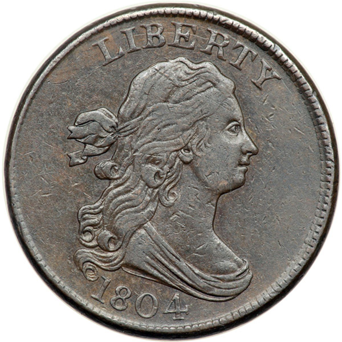 1804 C-9 R2 VF35. Slightly sharper but there are too many microscopic contact marks scattered over the obverse for the higher grade. Frosty chocolate and steel brown. Satiny luster covers the protected areas on the reverse. E-MDS, Manley state 2.0.