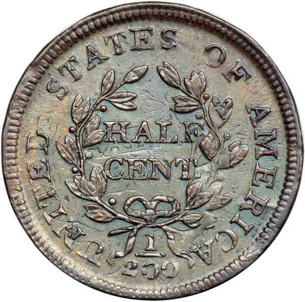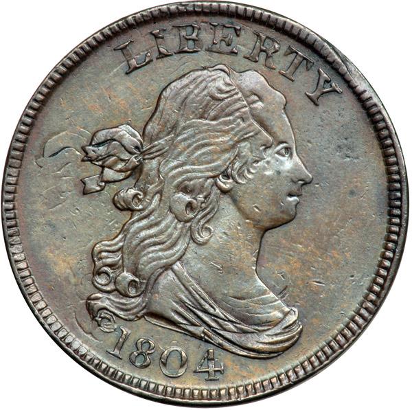 1804 C-9 R2 VF35. Double Struck Off Center. Ten points sharper but lightly burnished on the obverse and retoned. No notable marks or other flaws and the eye appeal is quite nice in spite of the retoning. Boldly double struck. The first strike was 20% off center to K-10.5 while the second was properly centered on the planchet but rotated 10-15 degrees CW relative to the first impression. There is sharp, clear undertype visible on both sides, and the majority of the undertype details are obvious, which is unusual. The face of Ms Liberty shows in her hair, the top of a 4 is located in the drapery above the other 4, and most of the wreath and all of HALF CENT from the first impression remain visible on the reverse. A spectacular example of a double struck half cent. EDS, Manley state 1.0, before the die crack at RTY. Davy #04.9.7.