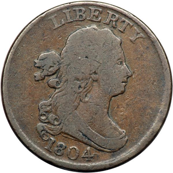 1804 C-9 R2 VG7. Triple Struck with Small Offset. Glossy light chocolate and medium brown. Smooth and attractive, very nice for the grade. This piece was struck three times. Two of the impressions were centered with a very small offset between the impressions. Fine but clear doubling shows along the upper edge of the head with less obvious doubling elsewhere on that side. The fine doubling on the reverse is more obvious, clearest on the wreath and HALF CENT. In addition, there is an arc of impressed dentils through the leaves under T in CENT. These dentils are incuse, which suggests an off center brockage impression. E-MDS, Manley state 2.0. The die crack through the top of RTY is clear. Davy #04.9.17.