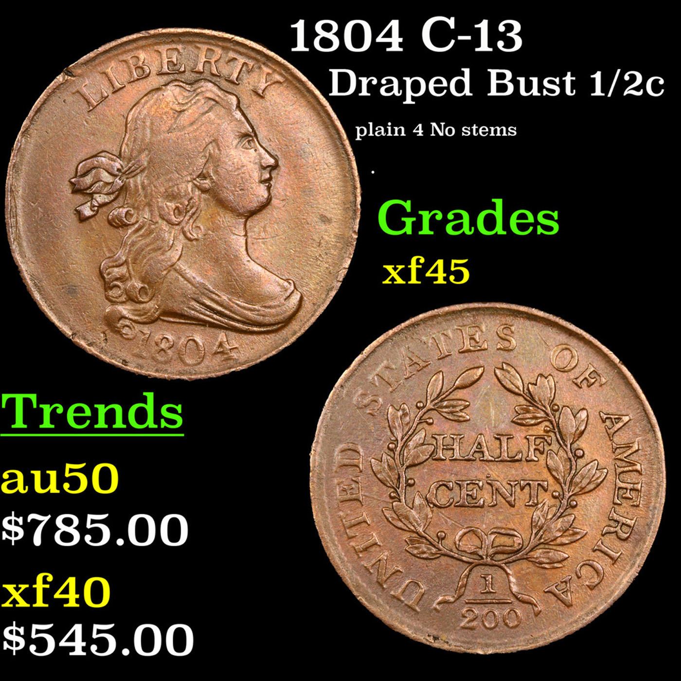 1804 C-13 Draped Bust Half Cent 1/2c Grades xf+.