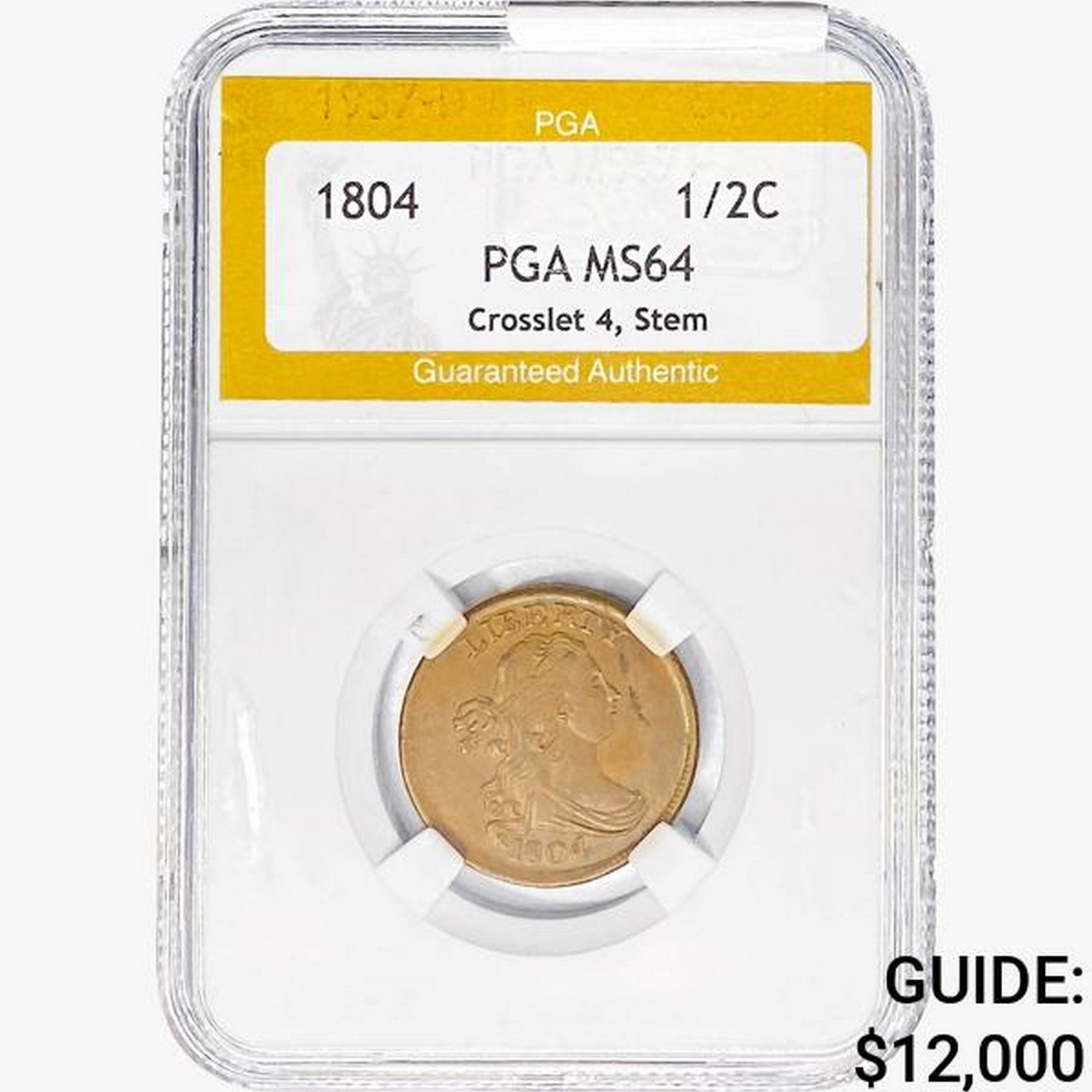 1804 Draped Bust Half Cent PGA MS64 Crosslet4,Stem