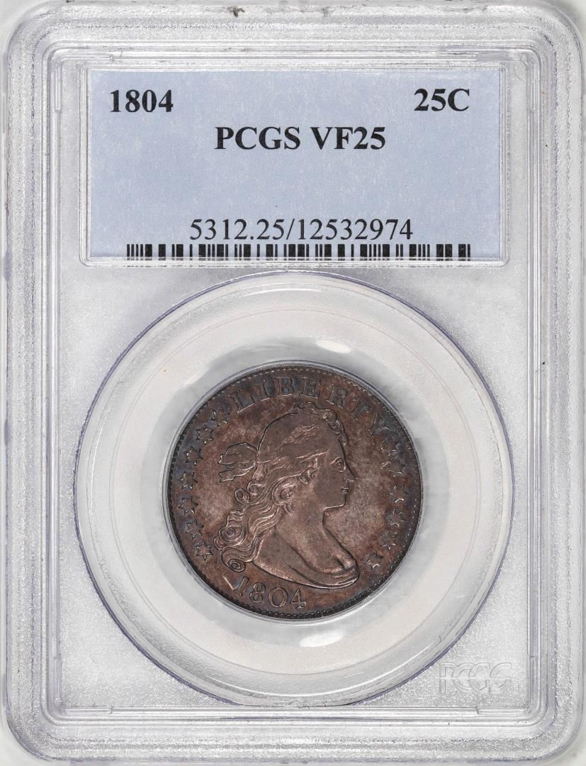 One 1804 Draped Bust Quarter Coin PCGS VF25. PCGS Graded.
