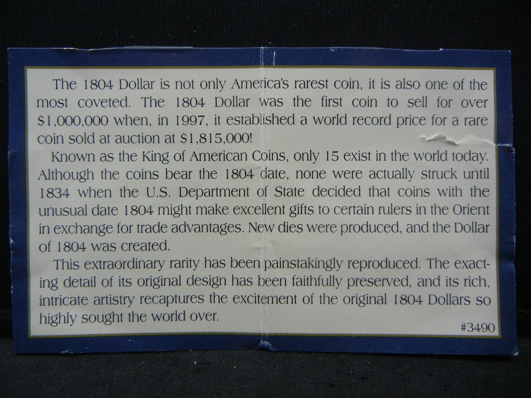 1804 Draped Bust Silver Dollar Reproduction With Certificate of Description.
