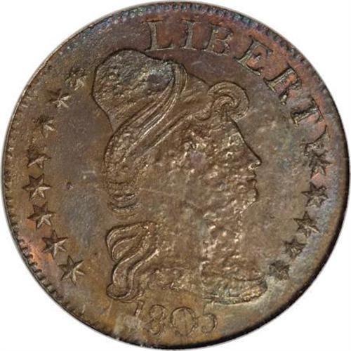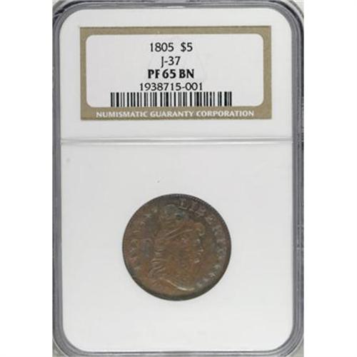 <B>1805 Five Dollar, Judd-37, Pollock-6115, R.8, PR65 Brown NGC.</B></I> A private striking made from scrap dies of the regular issue 1805 five dollar. Struck in copper with a plain edge. The dies were broken and heavily rusted and sold by the mint in the 1860s as scrap. They were most likely sold to Joseph Mickley or Montroville Dickeson. Obviously only a few pieces could have been struck from such badly deteriorated dies. USPatterns.com records one in silver, two in copper, one in white metal, and a uniface obverse splasher in white metal. Medallic alignment. Much of the underlying mint red can still be made out beneath the brown patina that covers most of each side. Considering all the as-struck problems, this piece is surprisingly well preserved.<BR><BR><b>Shipping:</b> Coins & Currency (<a target="_blank" href="http://www.heritageauctions.com/common/shipping.php">view shipping information</a>)