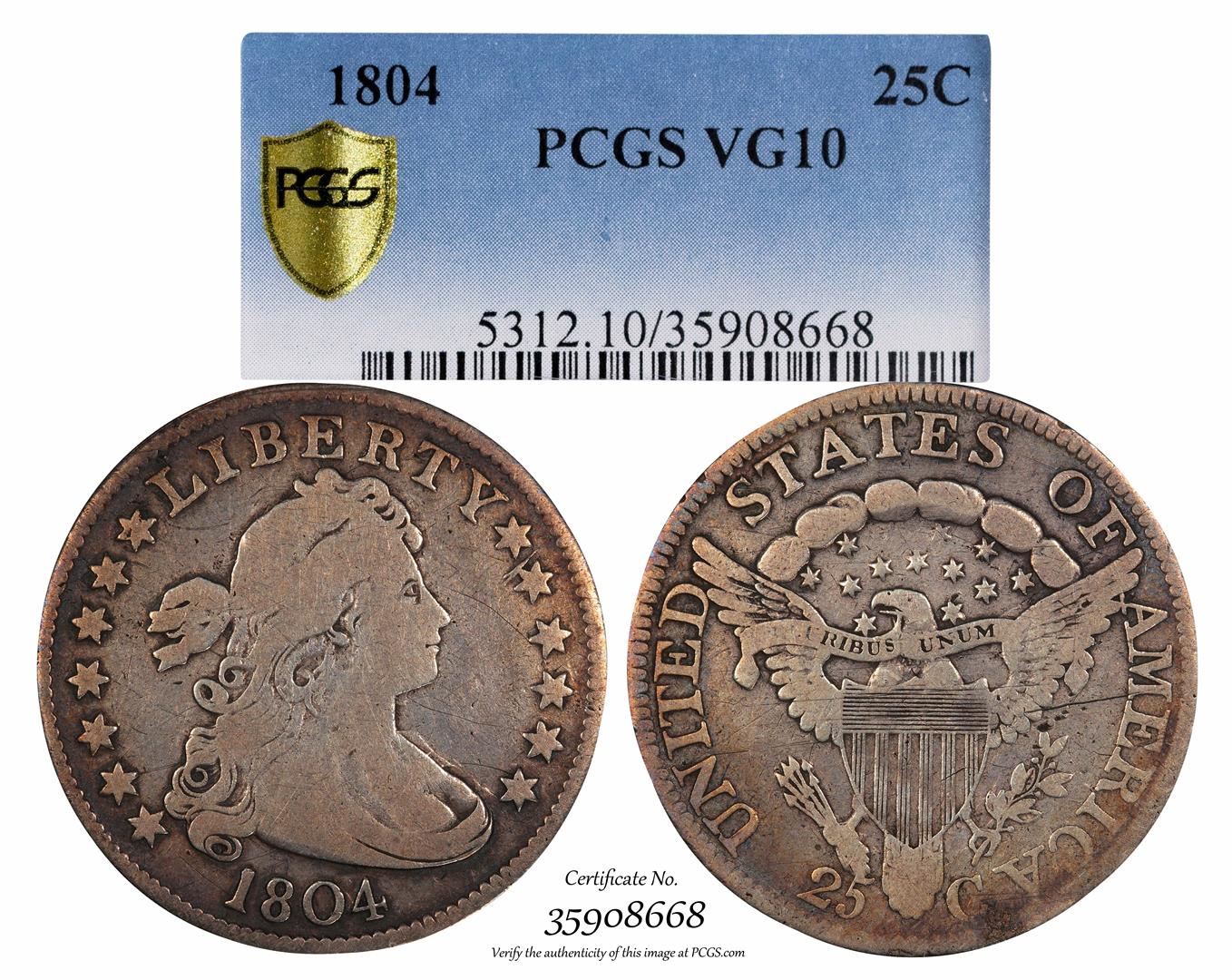 One 1804 Flowing Hair Quarter Dollar Coin PCGS VG10. PCGS Graded.