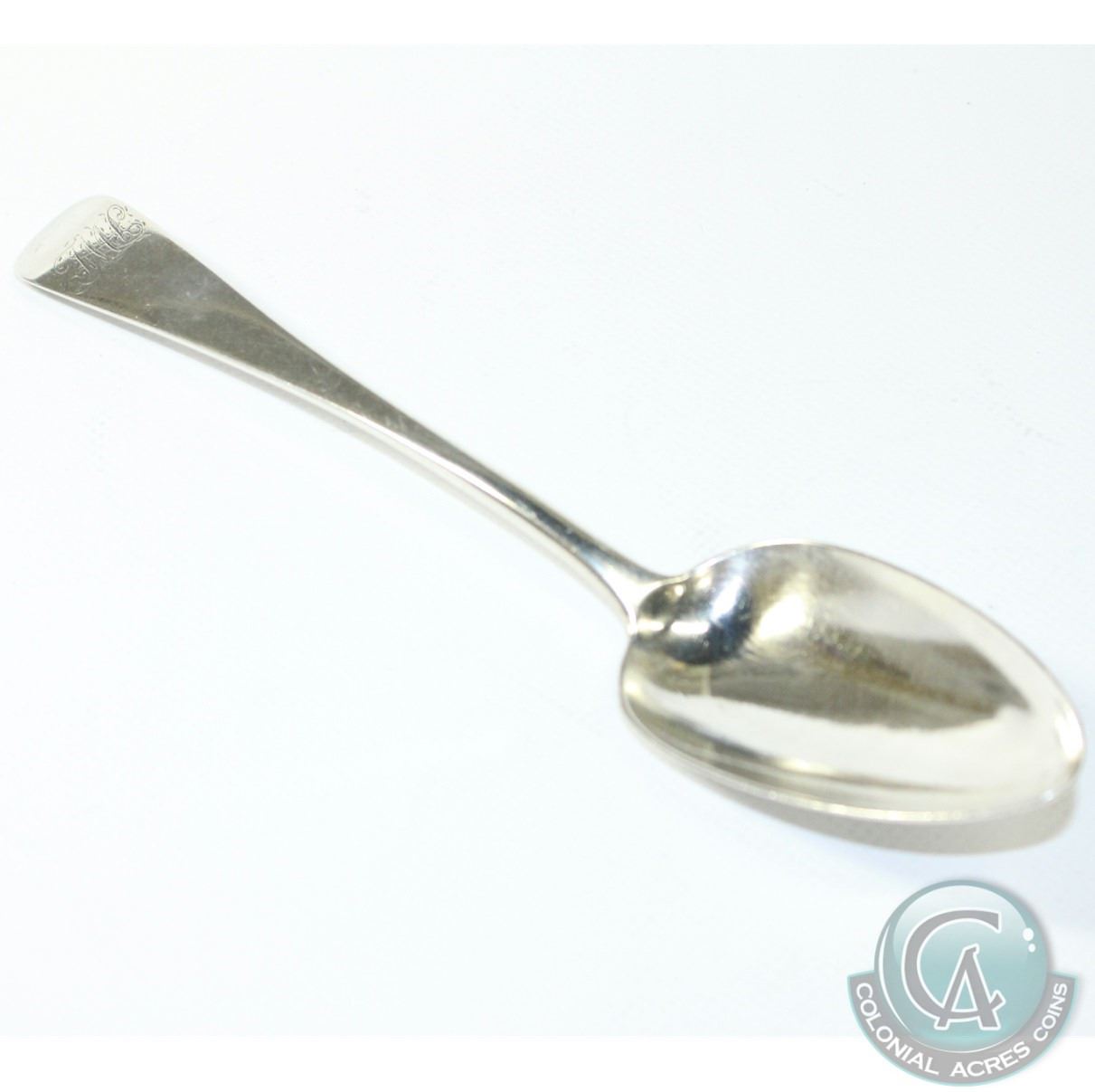 1804 London; William Eaton Sterling Silver Serving Spoon. Spoon measures approx. 8 3/4 inches in length with a weight of 70.21 grams. Has been monogrammed with 'TML'.