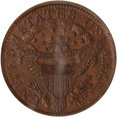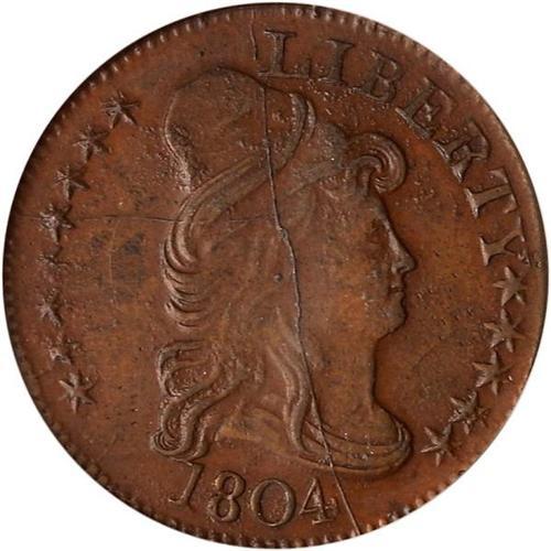 "The obverse is believed to be an altered 1807 die, redated to 1804. It shows several cracks, one of which bisects the obverse from 11:30 to 5:30. The reverse has not been identified. Both dies are heavily rusted.