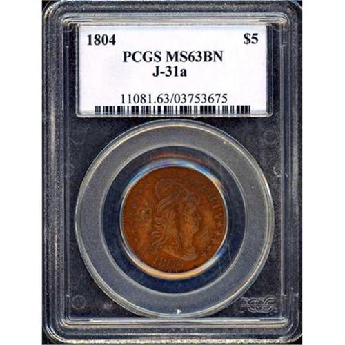 <b>1804 Pattern Half Eagle. Copper, reeded edge. Judd-31a. Pollock-6085. PCGS graded MS63 BR.</b> The unusual restrike from regular dies from an unused discarded die of regular issue. The reverse appears to be one of the 1804 reverses strengthened to near unrecognizability. It is believed this and the 1804 restrike cents (see Judd-28) were made about the same time. To say the least this is a rare and unusual coin!