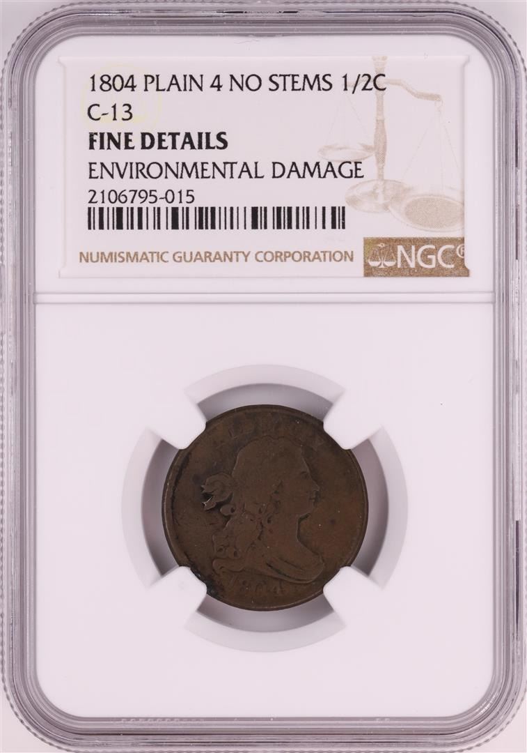 One 1804 Plain 4 No Stems C-13 Draped Bust Half Cent Coin NGC Fine Details. NGC Certified.