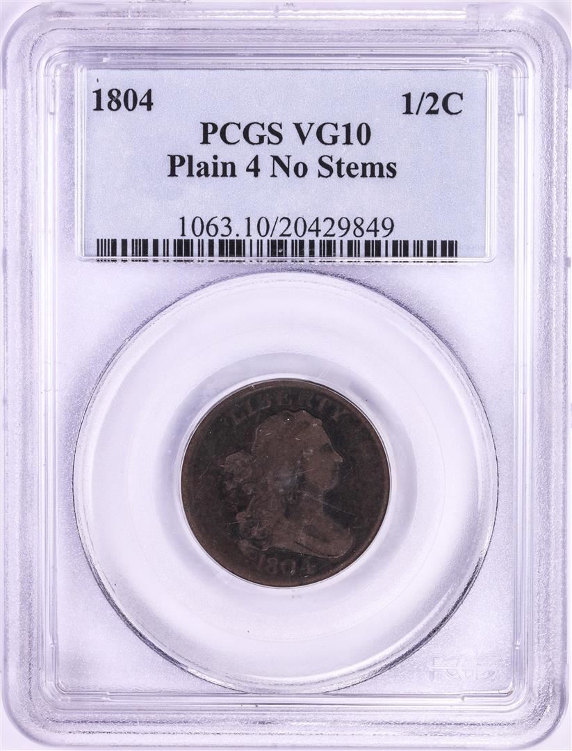 One 1804 Plain 4 No Stems Draped Bust Half Cent Coin PCGS VG10. PCGS Graded.