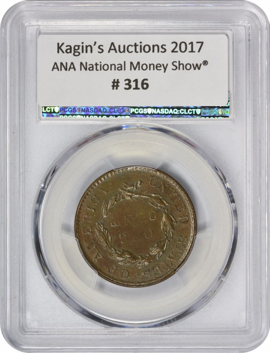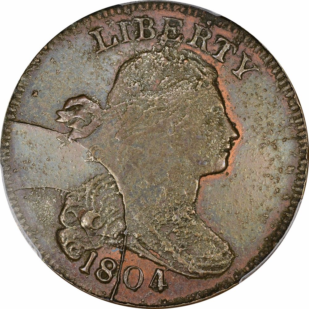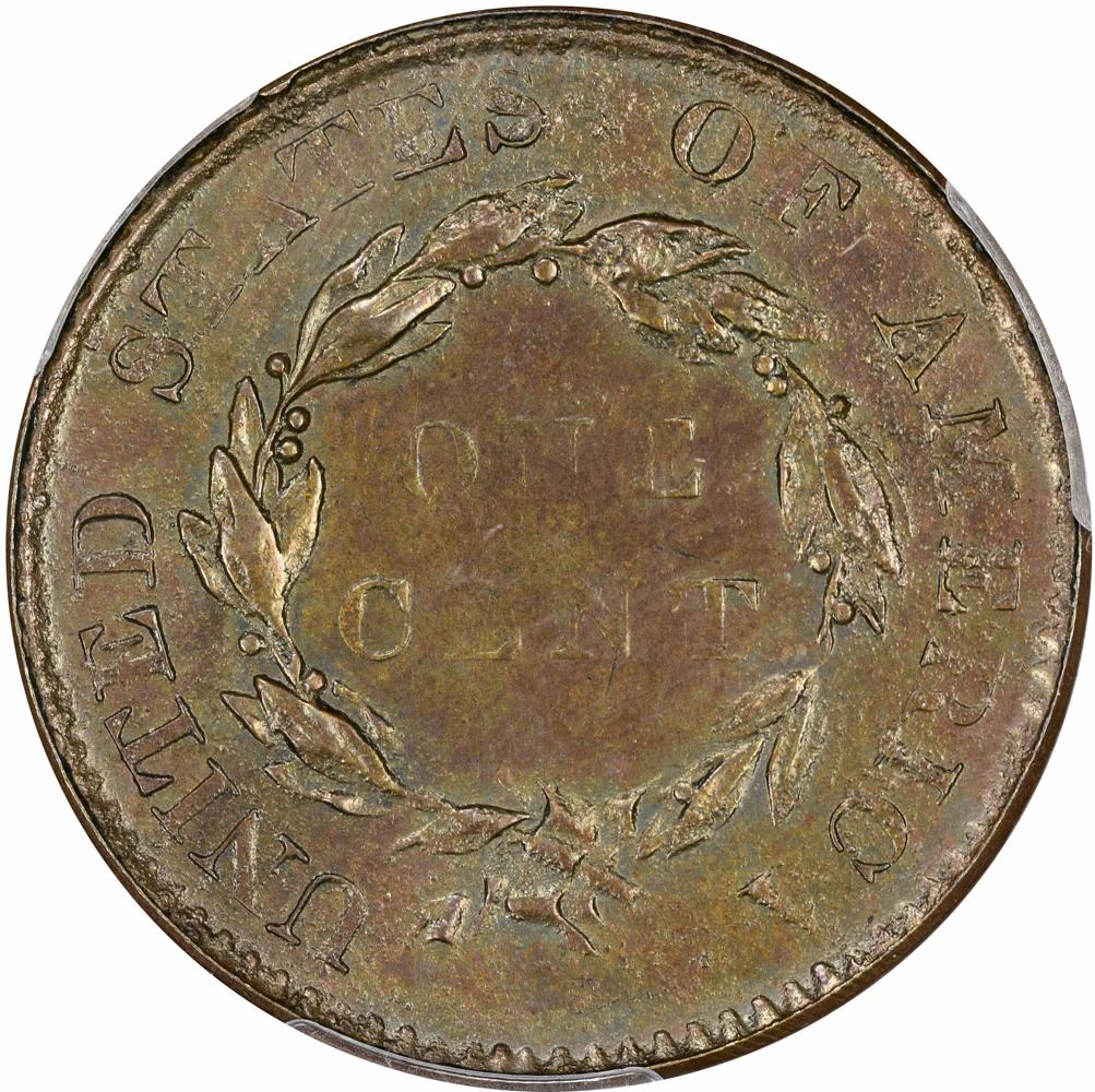 This perennial favorite with large cent collectors was struck from a badly cracked, rusted, and re-worked 1803 obverse die coupled with the reverse die of an 1820 Matron head cent. It is thought some 400 to 700 examples of this concoction after-the-fact could exist, and many are in Mint State. The obverse of the present piece is deep golden brown throughout with a blaze of bright and frosty orange at LIBERTY, the date, and along Liberty’s profile. The modestly reflective reverse can best be called lilac-tan with traces of rich blue iridescence in a bold light source. “By whom struck is unknown, but it was at a period long after, when the dies were rusty, and certainly not at the Mint,” wrote coin dealer Charles Steigerwalt in the February, 1907 issue of The Numismatist; at that time, he referred to this issue as “these abominations.” The present example is far from an “abomination,” as one glance can tell. Its Mint State nature is readily apparent, and its quaint but nefarious charm shines through. Here is the perfect combination of grade, quality, and availability.