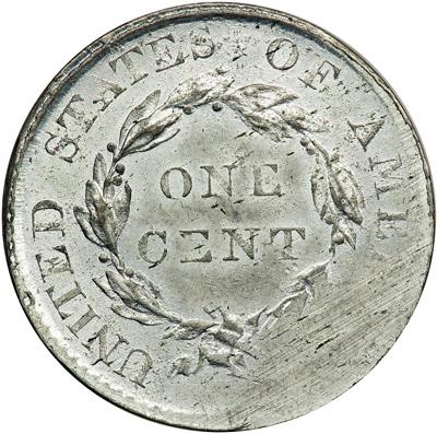1804 Restrike Uniface Reverse in Tin Judd-28 Rarity-8. PCGS graded MS-64. Frosty light silver fading to light silvery gray on the highpoints. Just a hint of friction on the highest points from mint state. Struck from a late state of the die (the 1820 N-12 reverse die, which reportedly was sold for scrap metal circa 1833 and subsequently lapped to remove rust and used privately in the 1860’s to strike the 1804 "restrike" cents). A thin area in the planchet at RICA obliterates those letters. A nick on the leaf under T in CENT is the only post-striking mark of any significance. Only two uniface reverse examples are known, along with a single uniface impression from the obverse die used to produce these "restrikes." This reverse was also used to strike an 1810 cent on a similar tin planchet, so assigning this piece to the 1804 restrike is debatable. However, since the 1804 restrike obverse is known by a similarly struck uniface example and the 1810 restrike is not, the connection is logical. Weight 113.1 grains. Our grade is AU58. DWH #3245.